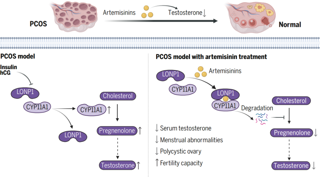 6月13日,基础医学院汤其群团队联合附属中山医院团队合作在Science杂志上在线发表了题为“Artemisinins ameliorate polycystic ovarian syndrome by mediating LONP1-CYP11A1 interaction”的研究论文,发现青蒿素类衍生物能够显著改善PCOS的疾病表型。研究人员发现青蒿素能够靶向线粒体蛋白酶LONP1,促进LONP1与其底物CYP11A1的结合,加速CYP11A1的降解,抑制卵巢雄激素的合成,降低PCOS患者的雄激素水平,改善月经周期及卵巢多囊样变。