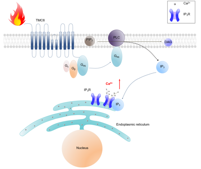 图1.TMC6通过Gαq-PLC-IP3R-Ca2+通路介导伤害性热感知