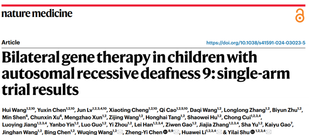 6月5日,附属眼耳鼻喉科医院、国家卫健委听觉医学重点实验室的李华伟教授、舒易来教授、王武庆教授团队领衔,联合哈佛大学医学院陈正一教授,在Nature Medicine杂志上正式发表了题为“Bilateral gene therapy in children with autosomal recessive deafness 9: single-arm trial results”的研究文章,这也是中国科研团队首次在Nature Medicine杂志发表耳聋基因治疗方面的创新成果。该研究证明了双耳基因治疗在先天性耳聋患者临床治疗中的安全性和有效性,极大地推动了耳聋治疗领域的发展,展现了基因治疗在治愈先天性耳聋疾病中的巨大应用潜力,受到了国际基因治疗领域专业人士的高度关注。