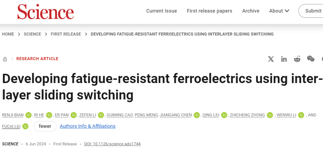 6月7日,材料科学系/光电研究院李文武教授团队、电子科技大学刘富才教授团队以及中国科学院宁波材料所钟志诚研究员团队基于二维3R-MoS2滑移铁电材料,联合提出一种性能优异的抗疲劳铁电系统。相关研究成果以“Developing fatigue-resistant ferroelectrics using interlayer sliding switching”为题于Science主刊在线发表。该研究为解决铁电材料领域长期存在的疲劳问题提供了一种全新途径,有望推动该材料在铁电存储器及类脑智能芯片等方面应用。