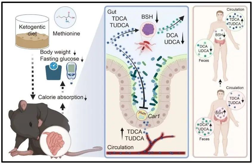 6月27日,生命科学学院洪尚宇研究团队和郑琰研究团队联合在Nature Metabolism期刊上发表了题为Ketogenic diet-induced bile acids protect against obesity through reduced calorie absorption的研究论文,揭示了生酮饮食通过诱导肠道微生物和特异性胆汁酸变化,减少肠道脂质吸收抵抗肥胖的分子机制。该研究发现肠道微生物依赖性的牛磺脱氧胆酸(TDCA)和牛磺熊去氧胆酸(TUDCA)是生酮饮食发挥抗肥胖作用的关键小分子代谢物,肠道碳酸酐酶1(Car1)是介导肠道脂质吸收的关键靶点。研究成果为肥胖及其并发症的治疗提供了潜在的新靶点和候选药物。