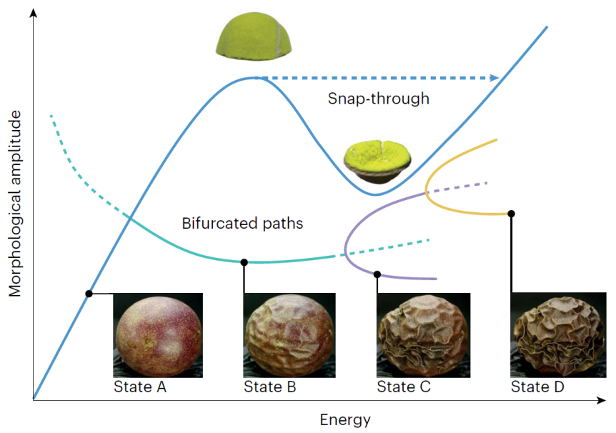 图1.变形能与形貌演化关系示意图,包含跳变失稳和多重分岔现象