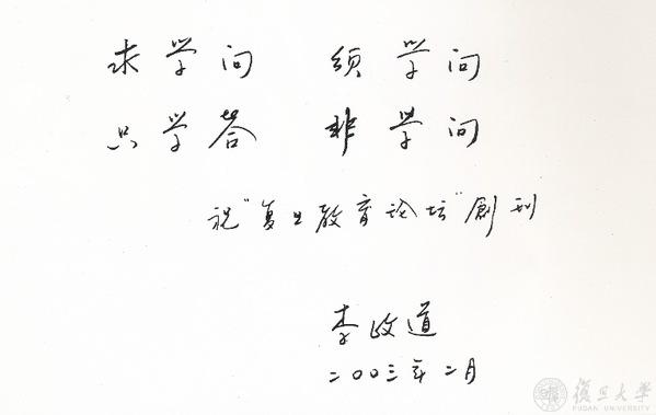 李先生曾为《复旦教育论坛》创刊题辞:“求学问,先学问。只学答,非学问。”关于大学教育,先生特别重视“问”,认为“学会问”比“学会答”更加重要。他尤为强调“艺术与科学不可分割”,这些理念与“博学而笃志,切问而近思”的校训不谋而合。