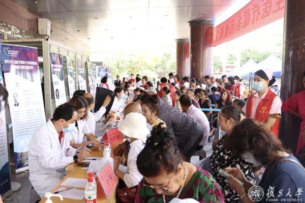 8月6日上午,复旦大学上海医学院博士生医疗服务团(以下简称“博医团”)在新疆喀什地区第二人民医院举行大型义诊,慕名而来的患者在现场排起长队。