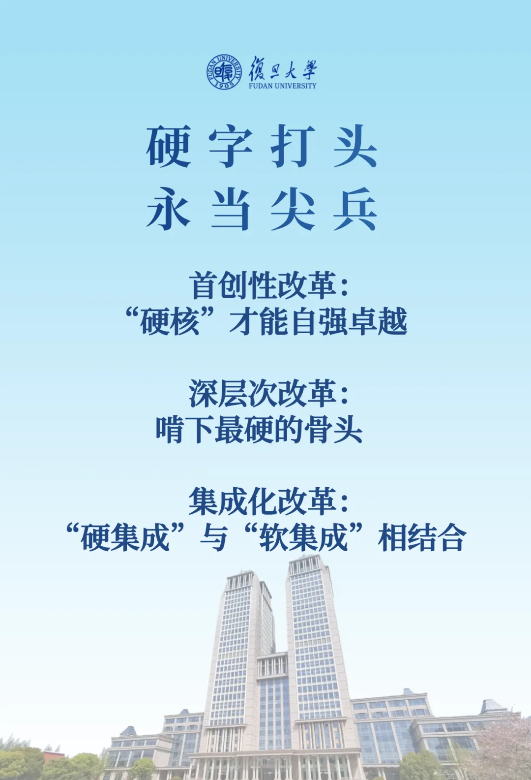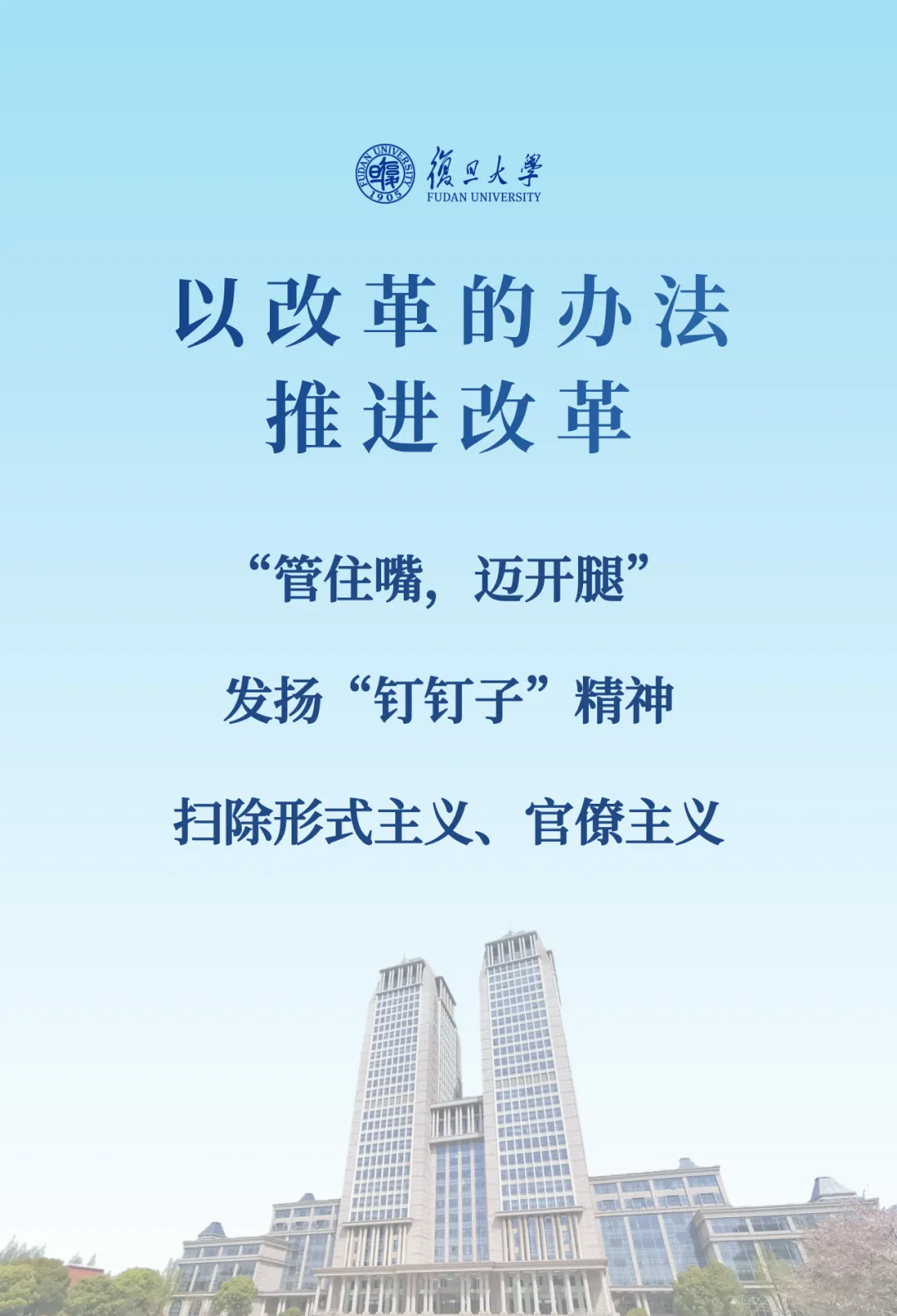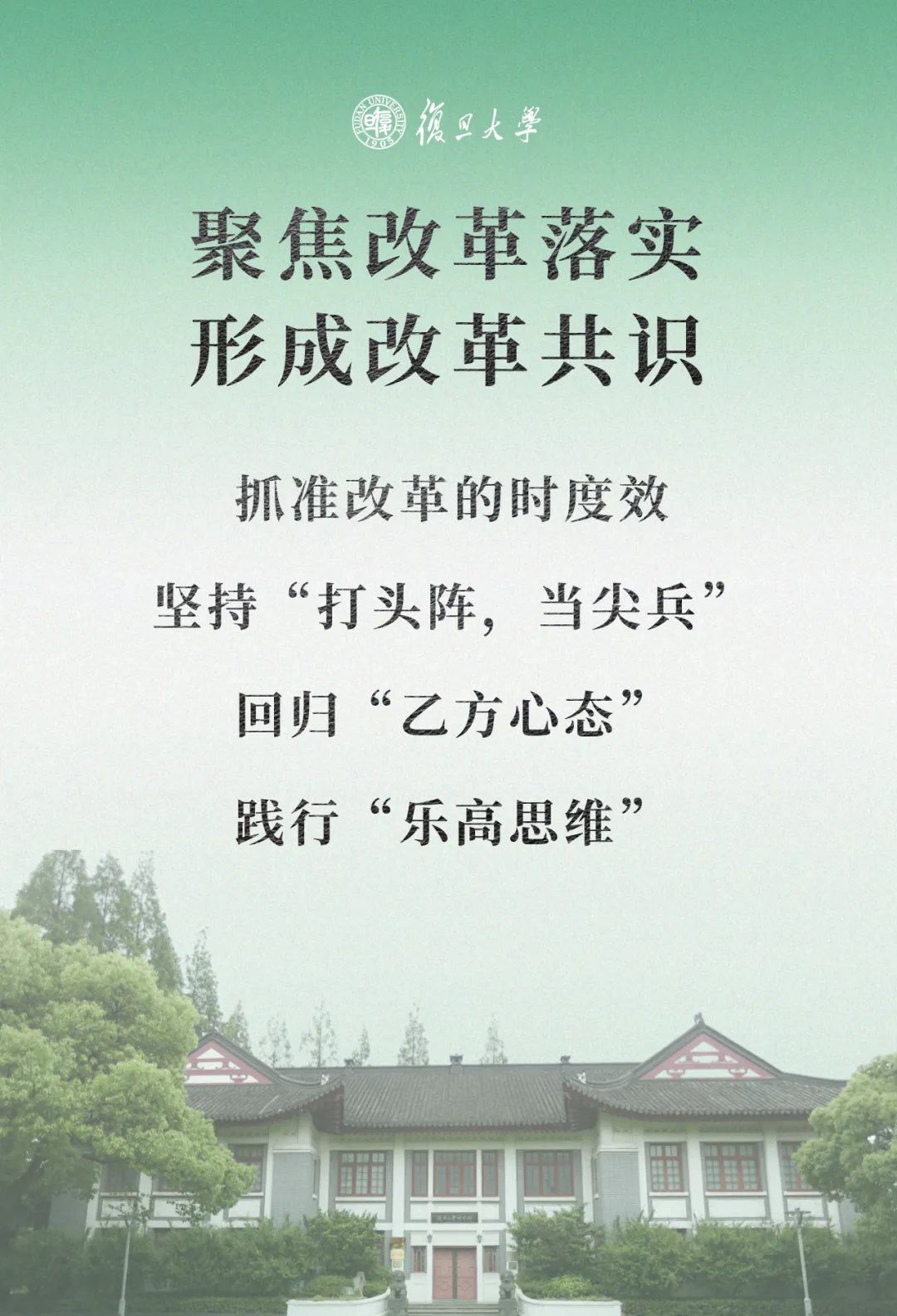 围绕学校教育科技人才一体改革,裘新对为何改、改什么、怎么改作动员。他强调,坚定走改革路,一刻也等不起。国家等不起,因为距离建成教育强国只有11年,需要以改革提速加档、提质增效,满足社会需要、满足民生需求,支撑国家战略、支撑引领中国式现代化。上海等不起,抓好高校综合改革,对于提升创新体系整体效能意义重大。复旦也等不起,要全力以赴抓住窗口期,尽快以改革破高质量发展之局、开辟创新型大学跨越之路,引领复旦再一次跨越式发展。