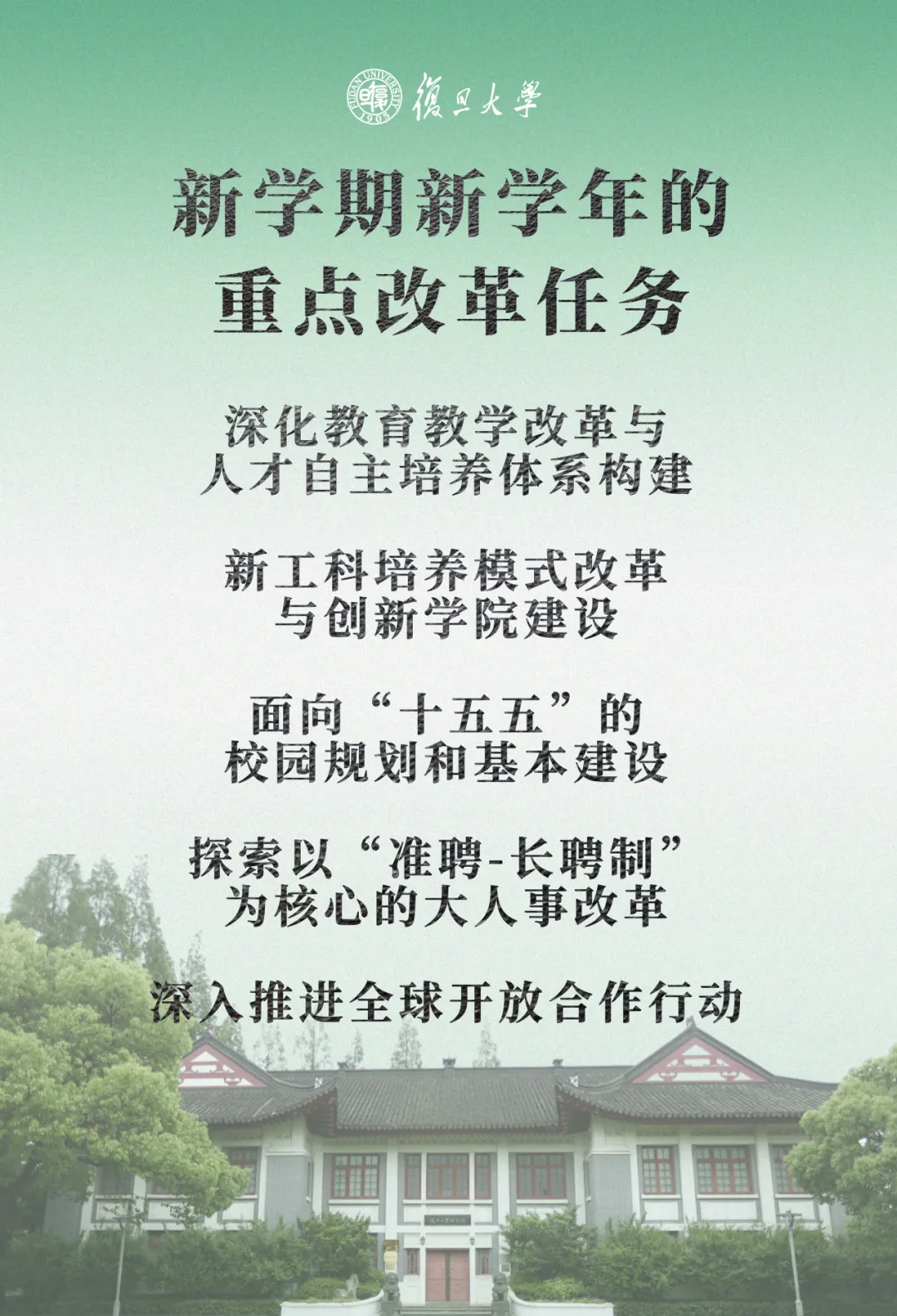 新学期新学年,金力强调要围绕五方面推进改革落实落地。一是深化教育教学改革与人才自主培养体系构建。聚焦培养国家重大战略急需人才、着力造就拔尖创新人才,推进招生改革、拔尖创新人才培养特区建设、本研教育一体化改革、终身教育体系改革,构建引领世界一流水平的人才自主培养大系统。二是新工科培养模式改革与创新学院建设。面向国家战略领域,构建新工科拔尖创新人才培养体系,按照“一院一策”原则,推动创新学院建构本研专业体系、建设教育教学体系、拓展实践教育体系、塑造培植新工科文化,走出理工融合支撑创新型大学建设的道路。三是面向“十五五”的校园规划和基本建设。围绕“校园更新”的总要求,有目的地搞基建,进一步优化校园空间使用。四是探索以“准聘-长聘制”为核心的大人事改革。面向海外大力引进高层次和优秀青年人才,提高引才起点水平和人才使用效益,改革薪酬分配机制,加强人员流动,充分激发各方面人才创新创造活力。五是深入推进全球开放合作行动。坚持高水平对外开放办学,健全大外事工作机制,在平台建设、项目建设、培养模式、联合办学方面努力突破。