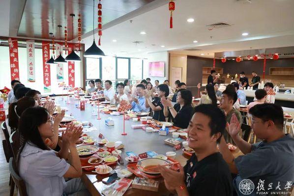 35位10月1日过生日的假期在校学生长桌围坐,同吃“生日面”、亲手做蛋糕,尝试酸奶刻字、咖啡拉花。校党委书记裘新,校党委副书记钱海红,校党委常委、宣传部部长方明与同学们一同庆祝、交流。