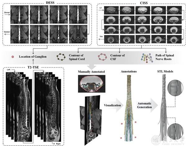 如何精准刺激脊髓神经根,对下肢相应肌群进行交替激活,从而重建行走步态,是第一个核心挑战。对此问题,加福民团队使用张江影像中心的3T磁共振成像设备,创新设计了包含多种扫描序列的成像方案,并基于人工标签构建自动化重建算法模型,从而精确捕捉腰骶段脊髓神经根结构特征。相关数据和生成的个体化脊髓神经根模型近期已开源,为神经康复领域专家开展脊髓神经调控基础研究提供支撑。