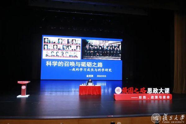 10月15日下午,中国科学院院士、复旦大学信息科学与工程学院教授金亚秋在相辉堂面向信息、微电子和公共卫生三个学院2024级本科新生,以《科学的召唤与砥砺之路——我的学习成长与科学研究》为题,开讲“强国之路”思政大课。