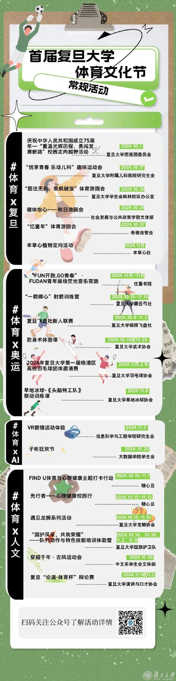 复旦大学体育运动委员会携手多部门,在2024年8月至11月举办首届体育文化创新大赛及校园体育文化节。大赛活动形式分为校园体育文化节开幕式活动和校园体育文化节常规活动。10-11月,还将有20多场精彩纷呈的体育文化节活动在复旦多个校区和周边社区开展。