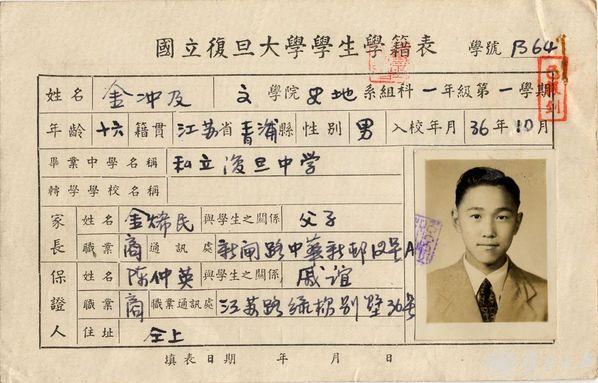 金冲及先生在复旦大学的学籍表