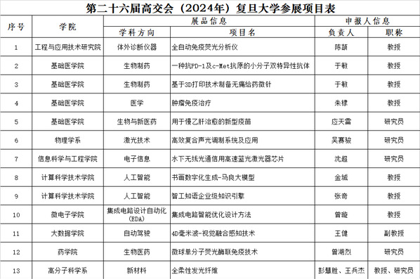 据悉,此次参展项目包括工研院教授陈颉的“全自动免疫荧光分析仪”、基础医学院教授于敏的“一种抗PD-1&c-Met抗原的小分子双特异性抗体”和“基于3D打印技术制备无痛给药微针”、基础医学院教授朱棣的“肿瘤免疫疗法”、基础医学院教授应天雷的“用于慢乙肝治愈的新型疫苗”、物理学系研究员吴赛骏的“高效复合声光调制系统及应用”、信息科学与工程学院研究员沈超的“水下无线光通信用高速蓝光激光器芯片”、计算机科学技术学院教授金城的“书画数字化生成-马良大模型”、计算机科学技术学院教授张奇的“智工知语企业级知识引擎”、微电子学院教授曾璇的“集成电路智能优化设计方法”、大数据学院副教授王健的“4D毫米波-视觉融合感知技术”、药学部研究员曾湖烈的“微球单分子荧光酶联免疫技术”、高分子科学系彭慧胜院士与研究员王兵杰的“全柔性发光纤维”。