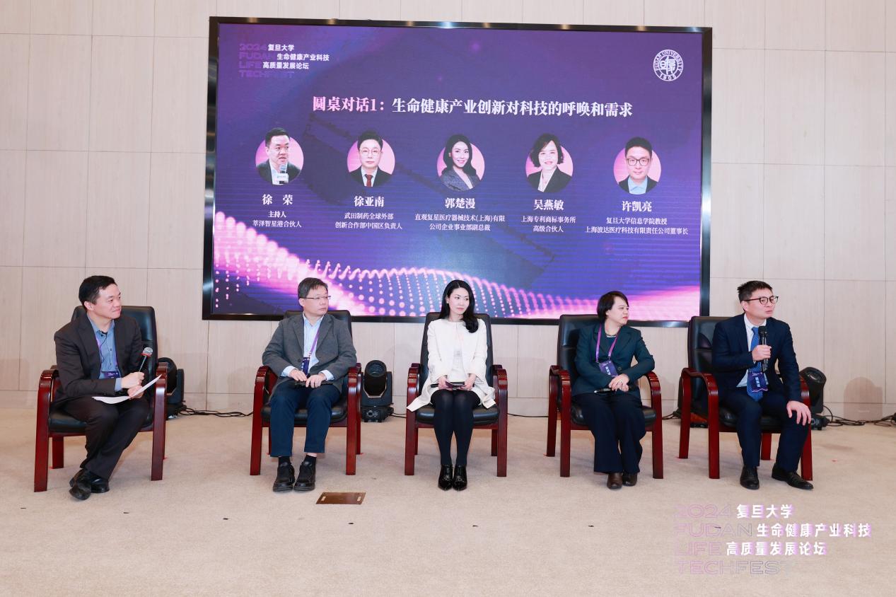 在圆桌对话环节,第一个主题聚焦于生命健康产业创新对科技的呼唤和需求,武田制药全球外部创新合作部中国区负责人徐亚南、直观复星医疗器械技术(上海)有限公司副总裁郭楚漫、上海专利商标事务所高级合伙人吴燕敏,分别从知识产权运用对和技术创新的支撑分享了自己的见解。复旦大学科技成果转化的代表、复旦大学信息学院教授、上海波达医疗科技有限责任公司董事长许凯亮分享了从创新者到经营者的转变体会,以及在科技成果产业化中实践的关键素养。