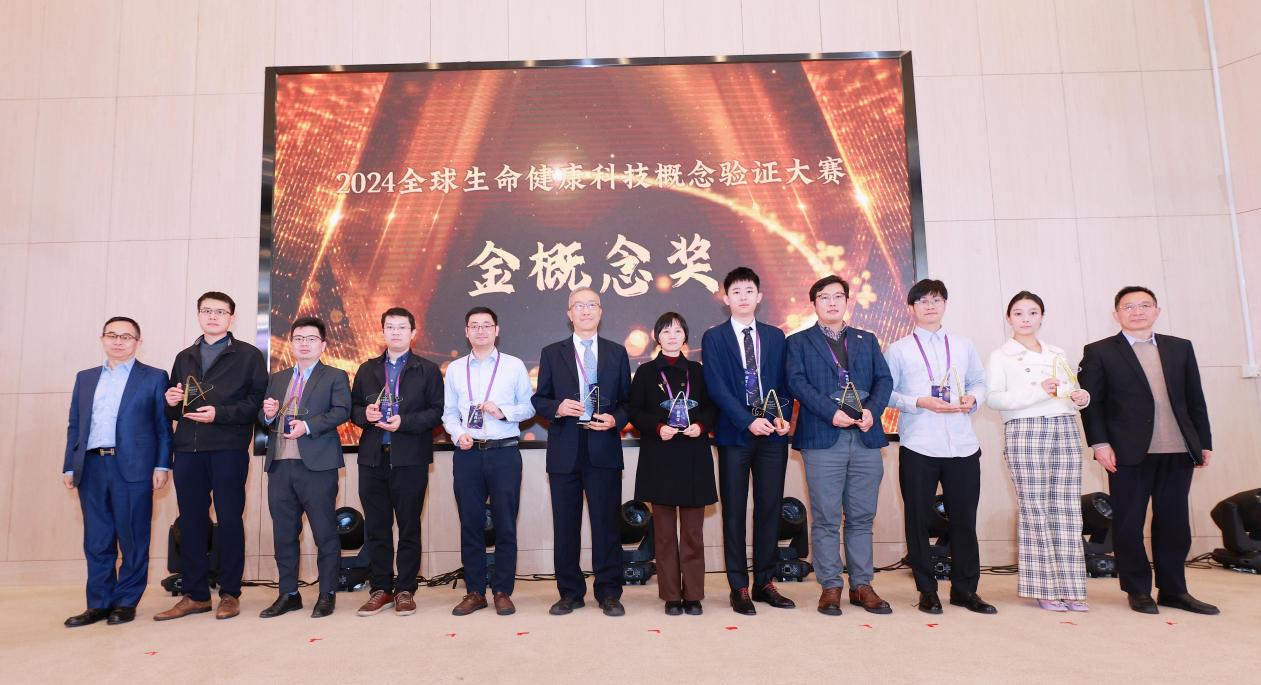 随后,2024全球生命健康科技概念验证大赛的“金概念奖”获奖团队进行了授奖仪式。此次大赛历时5个月,通过初复赛机制,深入陪伴辅导制定参赛项目团队的概念验证计划,最终复旦大学脑科学研究院抗癫痫及镇痛小分子药物研发、上海大学血管化器官芯片、交通大学医学院附属瑞金医院等10个创新项目脱颖而出,获得本次大赛的“金概念奖”。