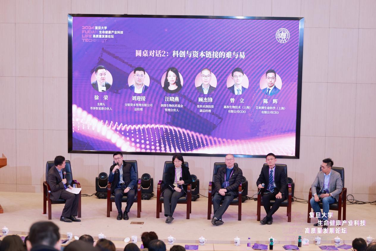 第二场圆桌环节围绕科创与资本链接展开。交银资本管理有限公司总经理刘迎接、润璞生物医药基金管理合伙人汪晓燕、张科禾润副总经理顾杰锋分别从银行金融投资、产业创新投资和地方区域创投的视角介绍了投资者关注点以及对创业投资的看法。两位校友代表惠和生物技术(上海)有限公司COO曾立和艾来博生命科学(上海)有限公司CEO陈辉以创业者身份,分享了在肿瘤及自身免疫药物开发和支持生命科研仪器开发从市场开拓到链接资本的经营体会。