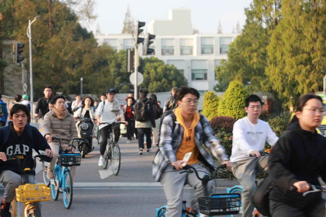 南区是本科生宿舍集中的生活园区,骑车前往本部教学楼是许多同学的便捷首选。然而,工作日每天近12000人次的流量集中在大课间的4个时间段,超高密度的上、下课车流给道路秩序带来不小挑战。“南区一期路口、学生超市路口,有一天连续发生两起相撞事故,前后仅隔几个小时。”