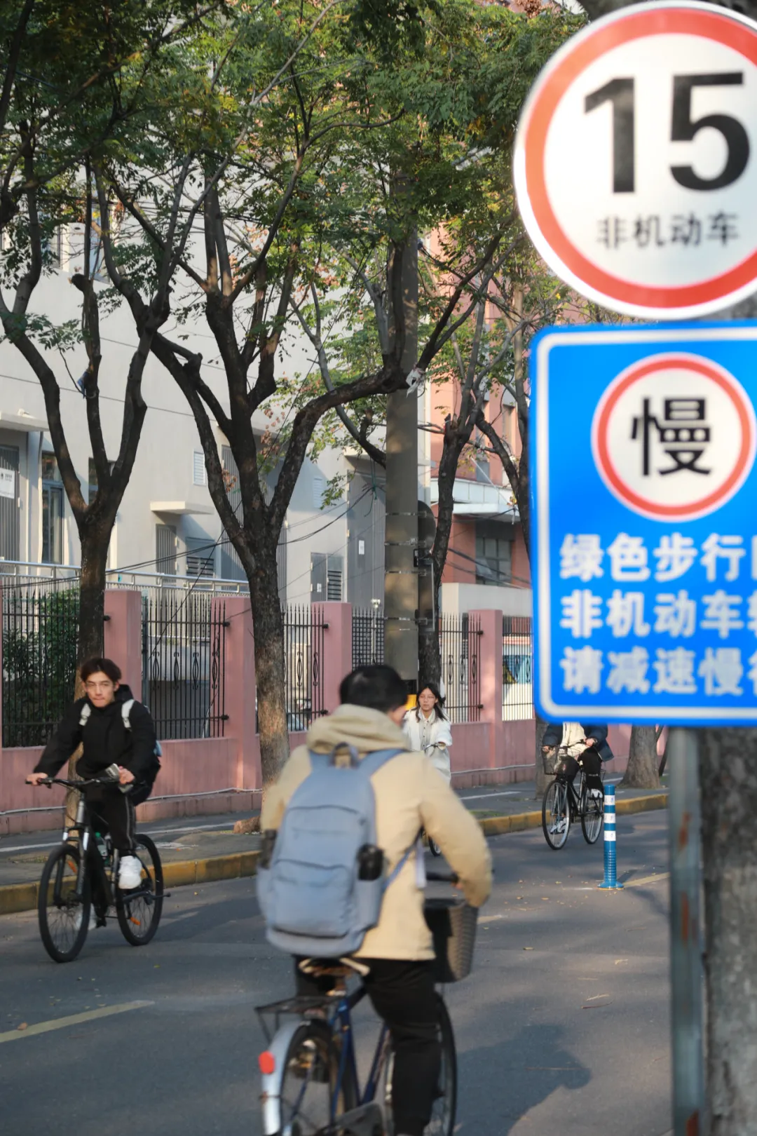 崭新的交通立柱、太阳能地灯、限速路标等,将政肃路校内段一分为二,自行车往来自动靠右慢行,出行安全更有序。日前,复旦南区多条道路试行“行人、非机动车慢行区”,这也是复旦四校区首个“慢行区”。
