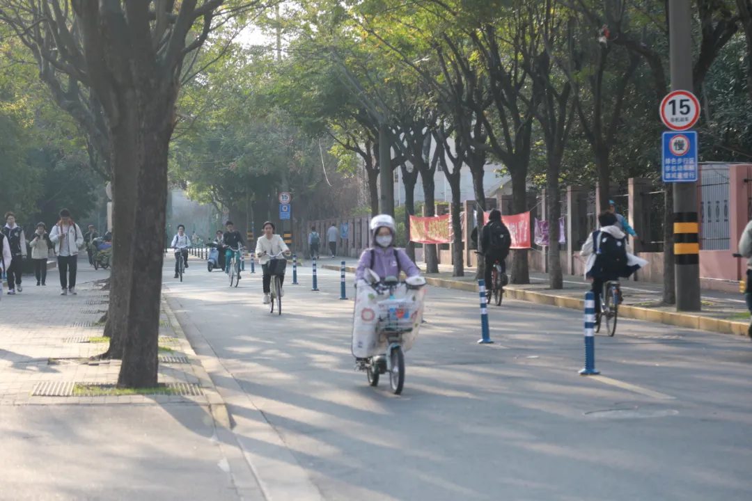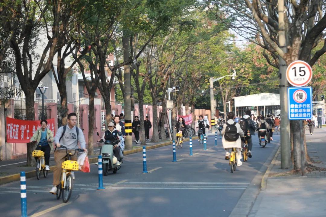 “南区逆行的情况改善许多,上学、放学高峰期,交通特别有序。最惊喜的是,减速带消失了。”“慢行区”试行两周,从南区骑车往返本部上课的同学们发现,昔日令人头疼的“‘咯噔’克星”——超宽减速带已拆除。机动车被路口簇新的花坛,隔绝在主要宿舍区外,实现真正的“人车分流”。