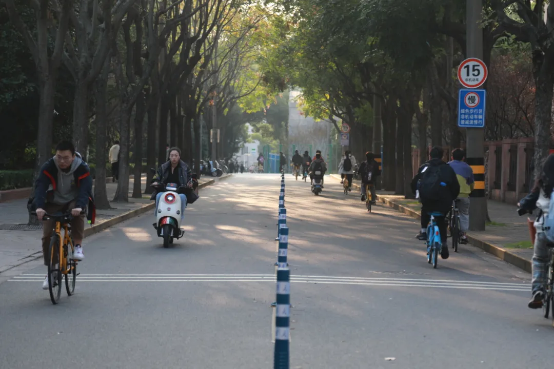 道路两旁限速牌下,大大的“慢”字划出“绿色步行区”,提醒往来车辆减速慢行。为防道牌刮蹭伤人,提示牌的边缘贴心地处理成圆角。“慢行区”自11月4日试行半个多月来,交通状况得到改善,保卫处相关负责人表示,“现在不管是在现场,还是从后台看录像,中间做了立柱后,大家更自觉靠右行走”,高峰期穿行车流秩序井然。