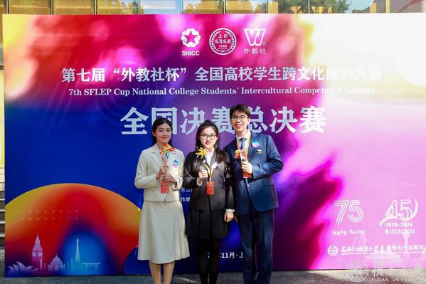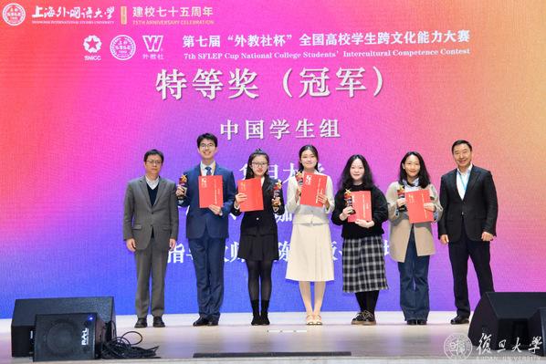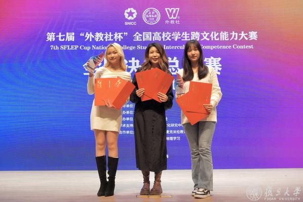 在中国学生组的全国总决赛中,复旦大学代表队夺得特等奖(冠军)和最具潜力奖单项奖,获奖选手为丁锦彤(经济学院 经济学类〔国际项目〕专业2023级本科生)、顾珈鸣(社会发展与公共政策学院社会学专业2023级本科生)和张泽熙(外国语言文学学院英文专业2023级本科生),他们的指导教师大学英语教学部陈可薇、席坤荣获特等奖(冠军)指导教师奖。