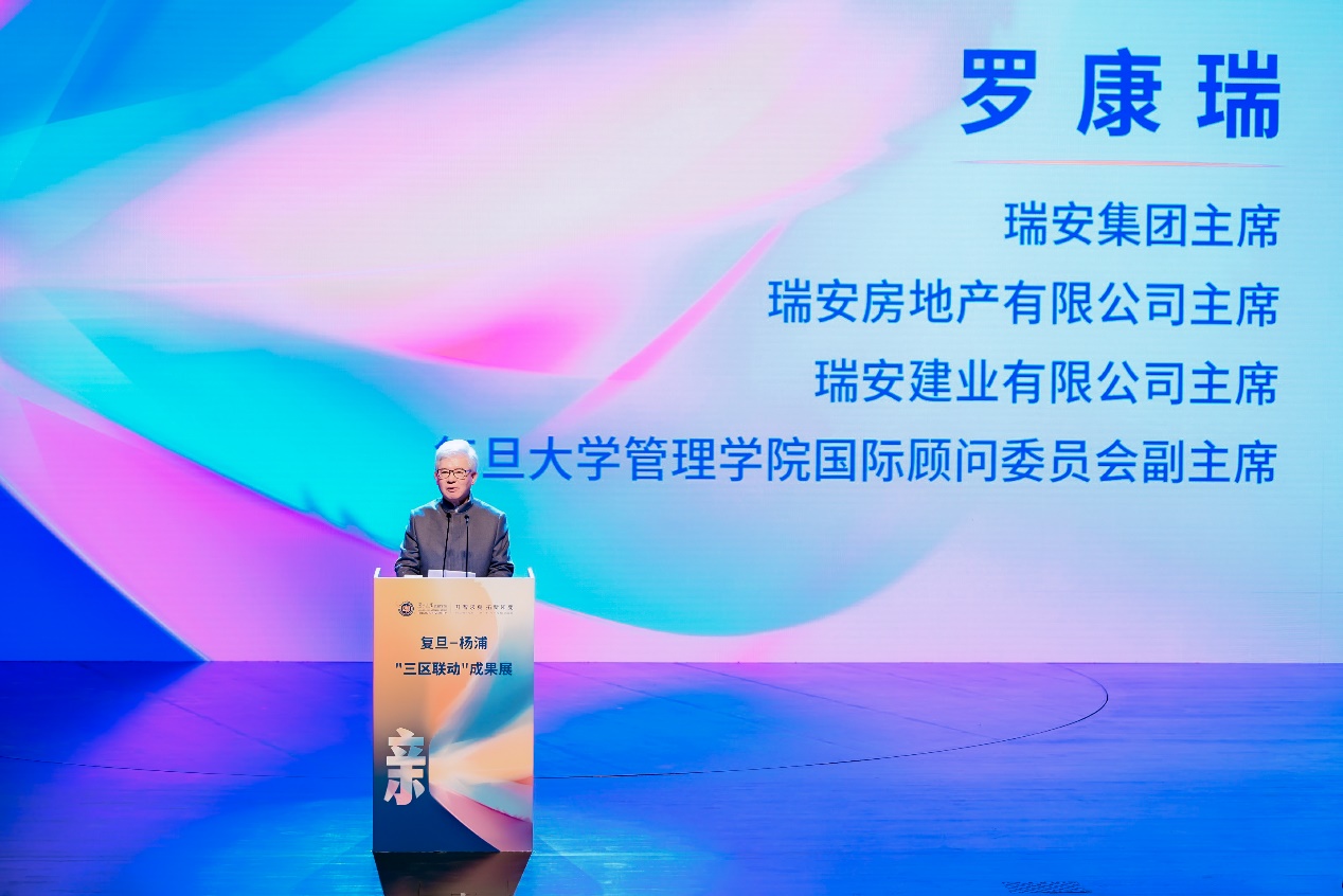 罗康瑞先生以多重身份参与此次盛会,不仅是作为复旦大学的前校董、管理学院国际顾问委员会副主席,也是杨浦区创智天地的建设者,管理学院政立院区项目的合作伙伴。他在致辞中表示,“我既是复旦的一份子,也是杨浦的老朋友,更是复旦管院人”。他在致辞中回顾了自2007年陆雄文院长首次提出宏伟构想,到2011年瑞安集团与复旦大学管理学院签署政立院区建设战略合作协议的初心和往事,为陆雄文院长、为全体管院人对教育事业的孜孜追求表示敬佩和感谢。他表示,复旦—杨浦“三区联动”成果展,见证了二十年来各方通力合作携手共赢的发展历程,他本人及其团队作为合作者,深感荣幸。希望未来,能够进一步推进和实现三区联动的跨越,为实现具有全球声誉的创新社区而努力。