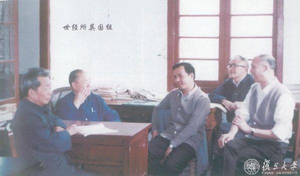 1983年,余开祥所长(左二)与英国组教师商讨科研工作