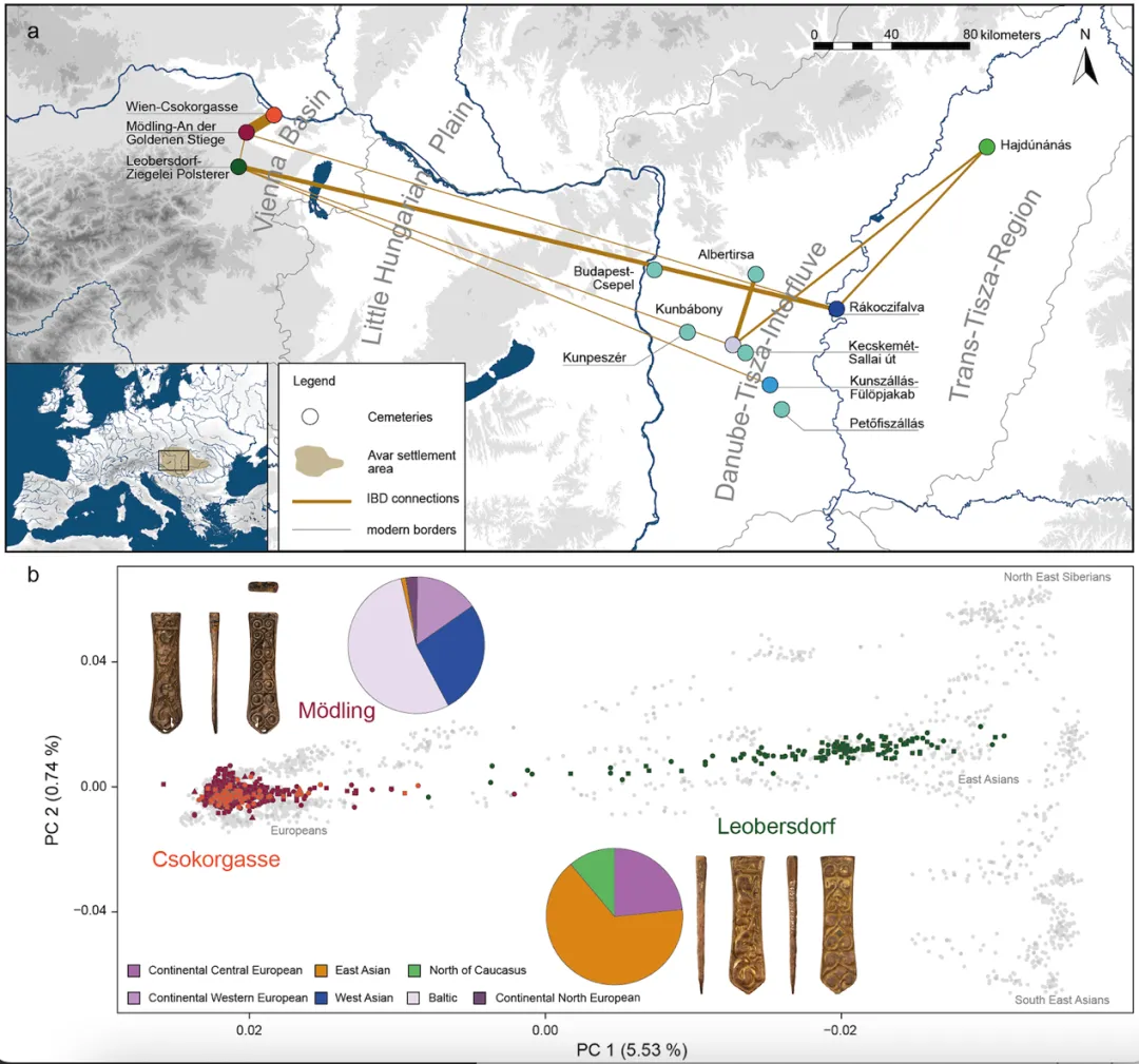 该研究是HistoGenes国际合作组织基于大型家族墓葬古基因组数据取得的重要突破。研究发现了奥匈平原上相距20km内的两个遗址古人群,来自亚欧大陆东西两端截然不同的基因来源,首次揭示阿瓦尔古人在遗传屏障下共享东亚游牧文化基因的现象。