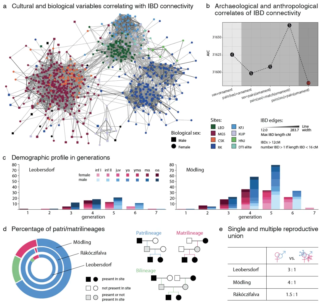 a图展示生物变量与文化变量的网络分析;b图展示考古学、体质人类学变量与生物血缘的关联性分析;c图显示人口年龄占比;d图显示父系与母系谱系数量占比;e图显示单偶制与多偶制所占比例。