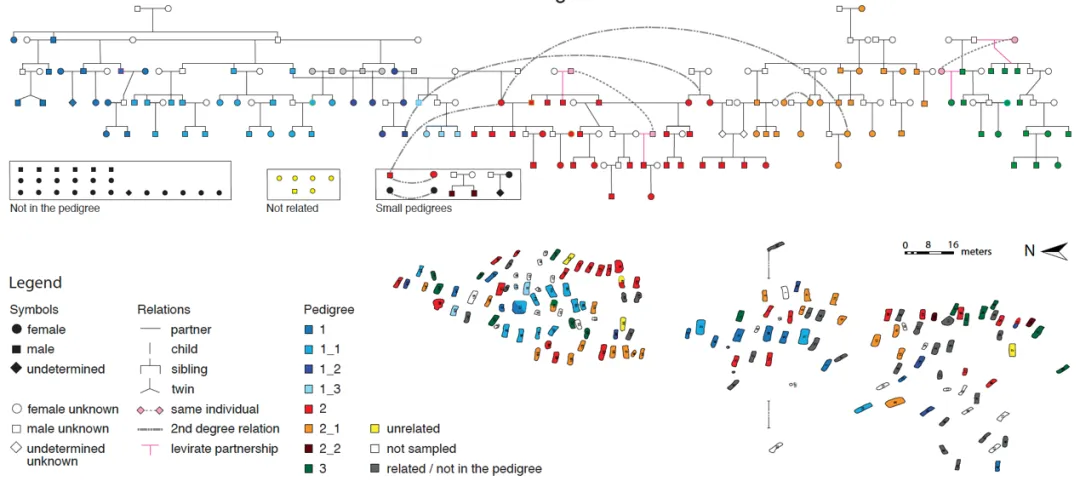 团队通过全墓地遗传亲缘关系分析,继而发现90%的埋葬者均具备亲缘关系。依据遗传学推断中的亲缘关系,结合体质人类学推断的骨骼年龄和考古学推断中的年代先后顺序,研究团队得以重建跨越三个世纪的大型家族谱系,揭示墓地中的父系氏族、多偶制和收继婚等现象,重现其古代人口的婚配制度、跨世代的人口动态历史。