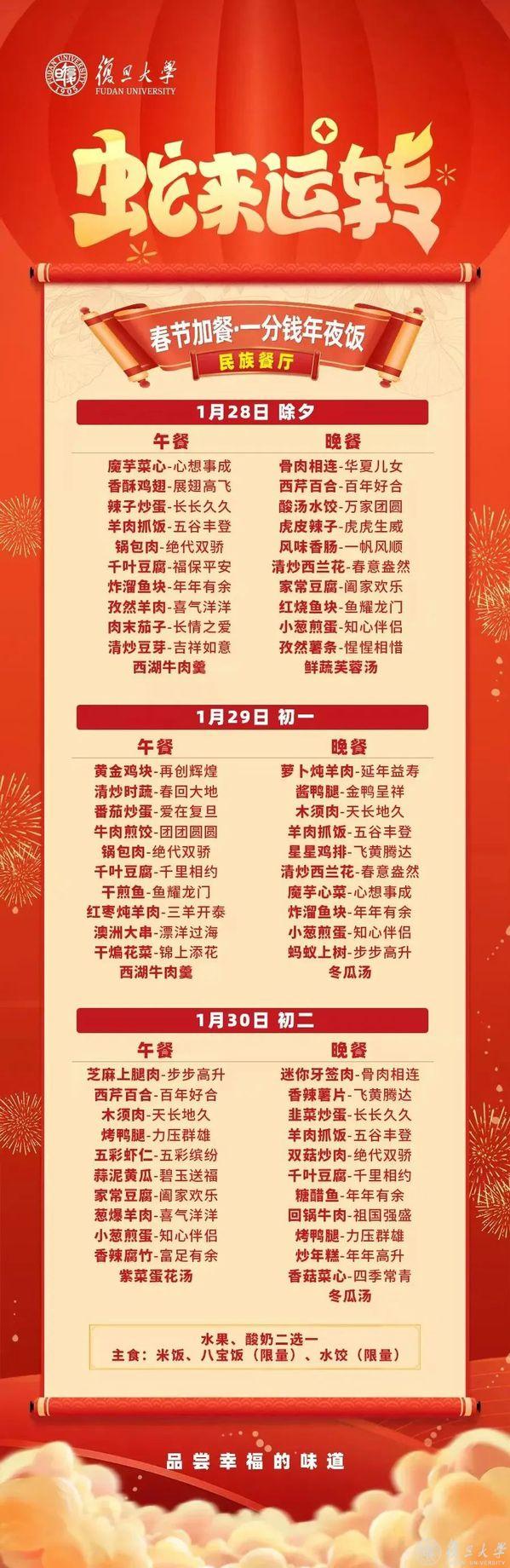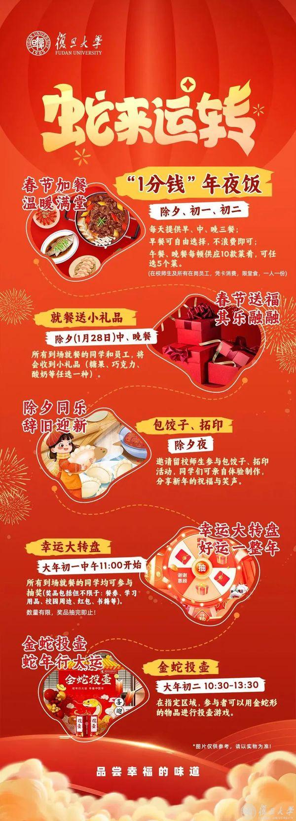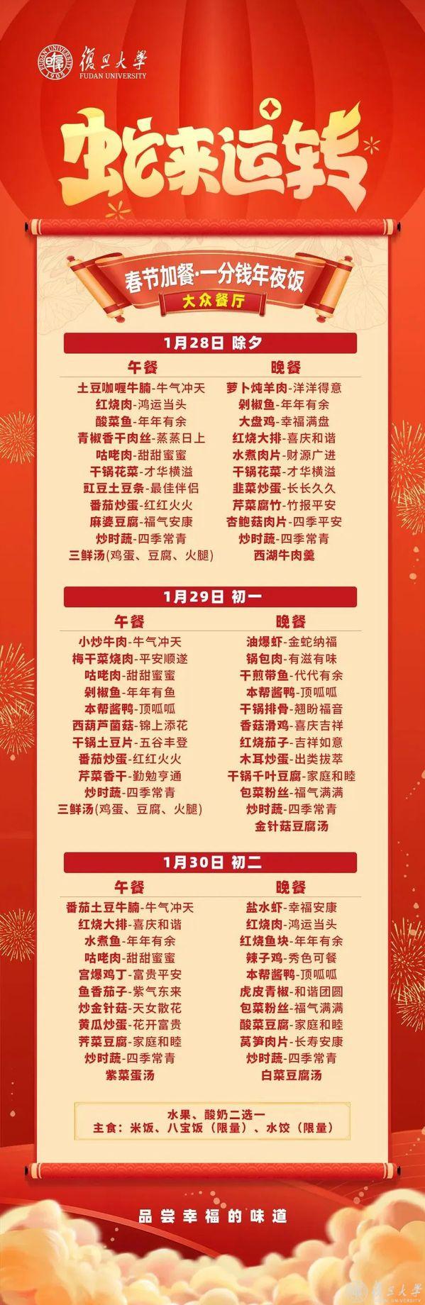 除夕、大年初一、初二,留校师生职工只需要凭卡消费一分钱,就可以享用美味的年夜饭!每人每餐可以任选五个菜哦!每人一份,仅限堂食,除夕当天就餐还有礼品可领取。