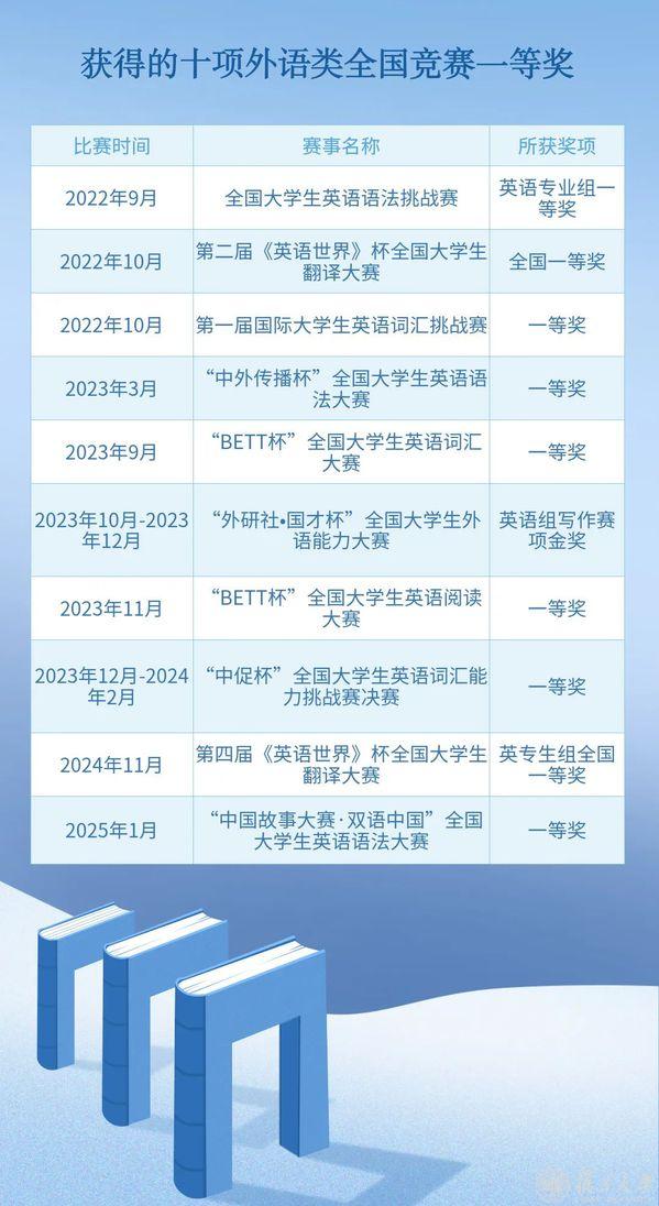 钱孟欣共斩获全国大学生英语写作、阅读、词汇、语法、翻译大赛一等奖10项。
