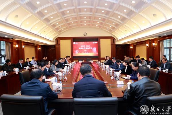复旦大学党委书记裘新,复旦大学校长、中国科学院院士金力,百联集团党委书记、董事长叶永明,百联集团党委副书记、总裁濮韶华共同见证签约。复旦大学常务副校长许征,百联集团副总裁史小龙代表双方签约。复旦大学副校长陈志敏主持。