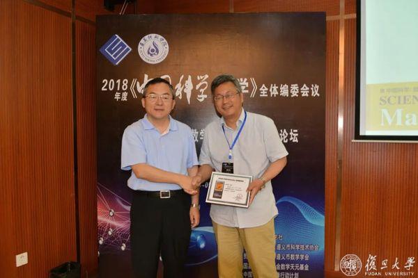 《中国科学:数学》副主编张伟平院士为傅吉祥颁发优秀服务奖