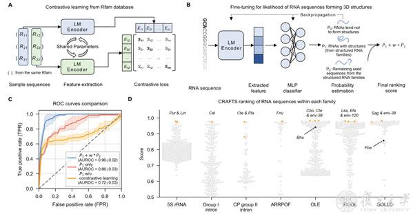 图 CRAFTS的性能评估,分析RNA家族结构特征。A. 对比学习用于确定输入对是否属于同一RNA家族。B. 微调模型以从每个RNA家族的序列中提取结构特征。C.基准数据性能表现:平均ROC曲线及标准差(基于5折交叉验证)。D. 对5S rRNA、I类内含子、CP II类内含子等家族分析。通过实验结构测定验证的序列以橙色标注。