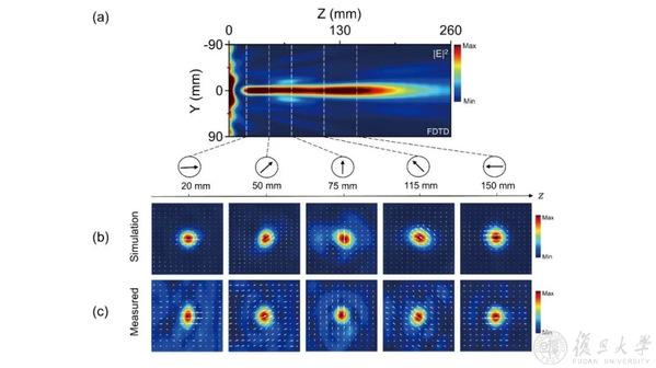 图 片上超构表面实现偏振态纵向演化的结构光场。(a) YOZ面|E|2场分布。(b-c) XOY面模拟及实验在不同高度位置处的偏振态分布。