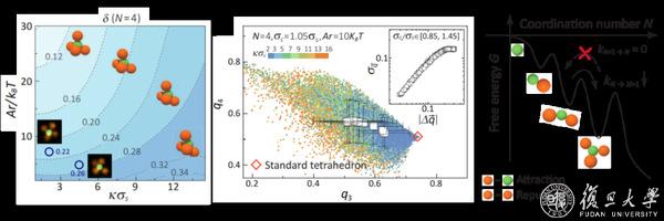 图 (a)4配位胶体分子的非对称性随卫星粒子间的排斥作用强度和作用距离改变;(b)4配位分子的角向序随着静电排斥增强,连续逼近标准对称构型;(c)胶体分子组装的动力学路径及其对应的能量图景。