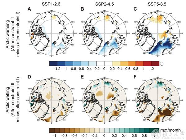 图 历史SIC分布对北极AWW涌现约束预估的影响。(A-C) 北极增暖的空间模态差异:对比同时应用历史全球变暖和SIC约束与仅使用历史全球变暖约束的结果(前者减去后者)。(D-F) 与(A-C)类似但针对未来北极降水变化。