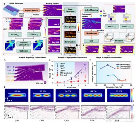 3月10日,信息科学与工程学院张俊文、迟楠研究团队与张江实验室合作,在探索下一代片上多维复用大容量光互连方面取得重要突破,设计并制造了一种硅基超紧凑数字超材料模分复用器,并成功实验演示了“模式-波长-时间”的多维复用信号调制与传输,单模单波速率最高可达324 Gb/s,总容量高达38.2 Tb/s,打破光互连领域多项记录。该成果以 “Edge-guided inverse design of digital metamaterial-based mode multiplexers for high-capacity multi-dimensional optical interconnect”为题发表在国际知名期刊《自然·通讯》(Nature Communications)上。研究团队通过结合时间、频率和模式的多维复用技术,突破了光互连系统在容量和频谱效率上的传统限制,提供了一种全新的解决方案来应对日益增长的智算芯片互连需求。该算法相较于传统数字优化算法效率提升了9.7倍,突破了逆向设计模式复用器的阶数限制,为人工智能、大模型训练、GPU加速计算等应用场景提供强有力的支持。