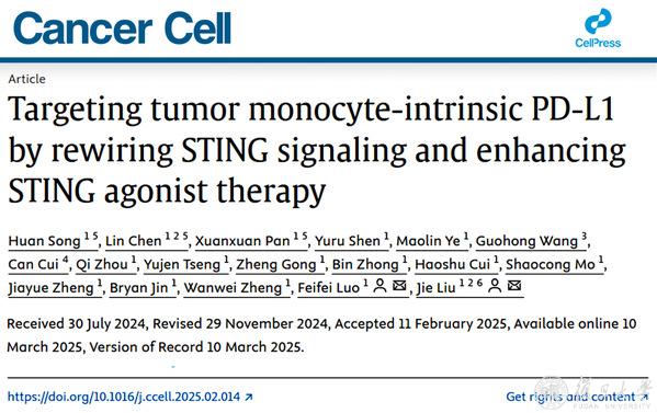 3月10日,复旦大学附属华山医院刘杰教授、骆菲菲研究员团队在Cancer Cell发表题为“Targeting tumor monocyte-intrinsic PD-L1 by rewiring STING signaling and enhancing STING agonist therapy”的研究论文,系统揭示了STING激动剂诱导单核细胞内源性PD-L1介导免疫抑制的全新机制,并提出通过STING信号重编程提升治疗疗效的新策略。该研究首次揭示STING下游通路之间的动态平衡决定单核细胞的功能命运,阐明单核细胞内源性PD-L1作为免疫检查点分子的非经典作用机制,并提出通过TLR2/STING信号重编程克服治疗抵抗的创新策略。