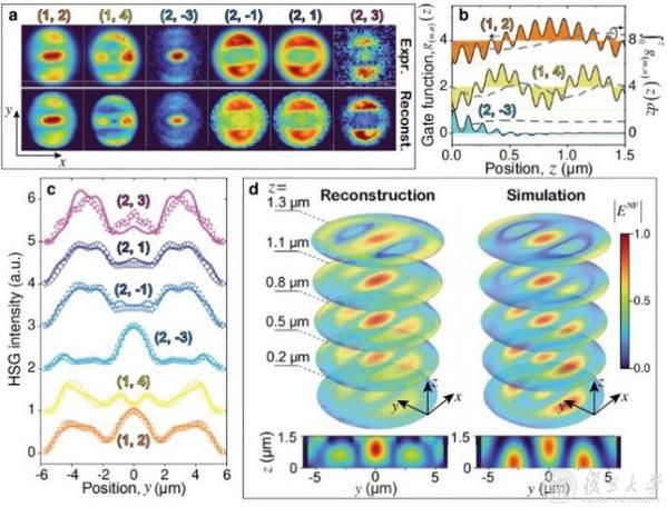 图 近场模式的层析成像。(a,c)各个阶次出射光强分布,实验vs.层析算法拟合结果。(b)不同阶次混频过程对近场不同深度的敏感性差异。(d)(基于实验的)层析拟合重建近场z向分布vs.(基于有限元的)模拟近场z向分布。