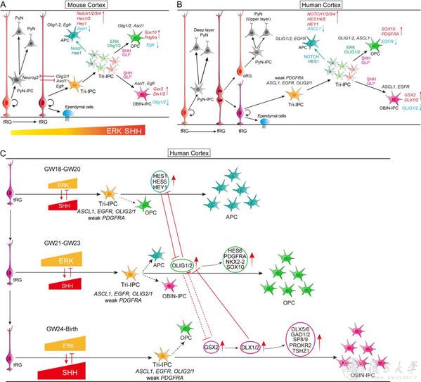 2月25日,脑科学研究院杨振纲团队以“NOTCH, ERK, and SHH signaling respectively control the fate determination of cortical glia and olfactory bulb interneurons”为题在《美国国家科学院院刊》(PNAS)发表科研论文。研究发现,在小鼠皮质发育过程中,放射状胶质细胞(神经干细胞)经历从神经发生向胶质发生的范式转换。研究结果进一步显示,当TRI-IPC产生之后,NOTCH-HES信号通路首先决定了TRI-IPC分化为大脑皮质内的星形胶质细胞,随后ERK-SHH协同促进了少突胶质细胞的命运决定,最后SHH-SMO-GLI信号决定了TRI-IPC开始产生迁往嗅球的中间神经元。该研究接着分析了国际人脑单细胞RNA测序数据库,证实该机制在人类大脑皮质发育中的保守性,即调控哺乳动物大脑皮质胶质细胞产生和命运决定的基本规律和分子机制是一致的。这也有望为脑胶质瘤的不同亚型的诊疗提供一个新的视角。