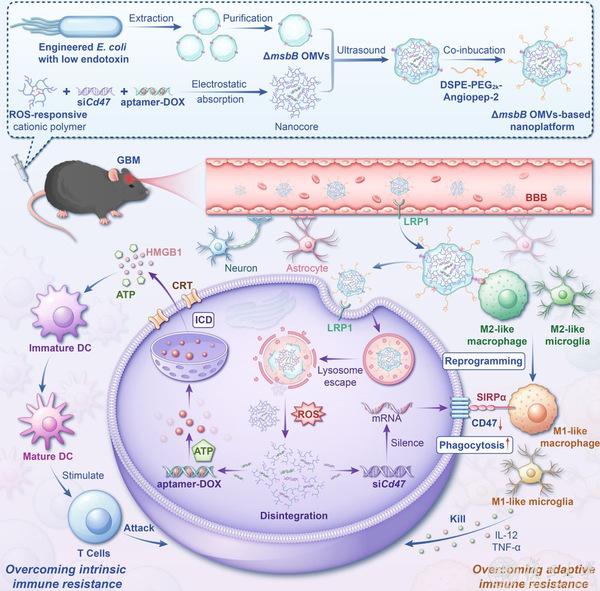 3月4日,药学院孙涛副教授、蒋晨教授研究团队引入了经过工程化改造的OMVs以降低毒性,并进一步通过简单的肽修饰构建了一个模块化组装的纳米平台。相关研究成果以“Engineered Bacterial Outer Membrane Vesicles-Based Doxorubicin and CD47-siRNA Co-Delivery Nanoplatform Overcomes Immune Resistance to Potentiate the Immunotherapy of Glioblastoma”为题,在线发表于《先进材料》(Advanced Materials)。据介绍,该纳米平台表现出令人满意的生物安全性,并且在Angiopep-2的协助下能够连续穿越BBB并靶向GBM。OMVs上的免疫原性物质以及所负载的CD47-siRNA和阿霉素能够分别促进巨噬细胞和小胶质细胞的重编程和增强其吞噬能力,并提高GBM的免疫原性,最终克服GBM 的免疫抵抗,增强免疫治疗的效果。