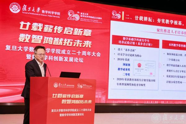 春秋代序,薪火相传,笔绘复旦新画卷;弦歌不辍,精微以继,鼎铭数学大文章。2025年,是复旦大学数学科学学院(下简称“数学学院”)成立20周年。20年来,复旦数学人传承先辈精神,在众多杰出学者的引领下打头阵、当尖兵,学院建设发展取得了丰硕成果。为共同见证学院发展历程中这一重要时刻,携手擘画复旦大学数学学科迈向世界一流前列的壮阔蓝图,4月26日上午,“廿载薪传启新章·数智鸿猷拓未来”——复旦大学数学科学学院成立20周年大会在复旦大学光华楼吴文政报告厅举行。