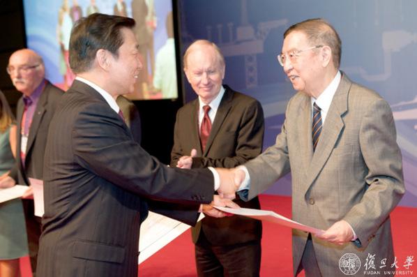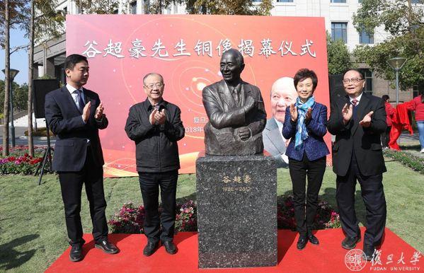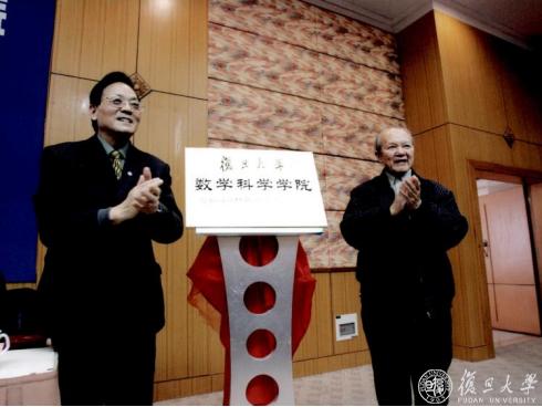 时任复旦大学王生洪校长与谷超豪院士为数学科学学院成立揭牌
