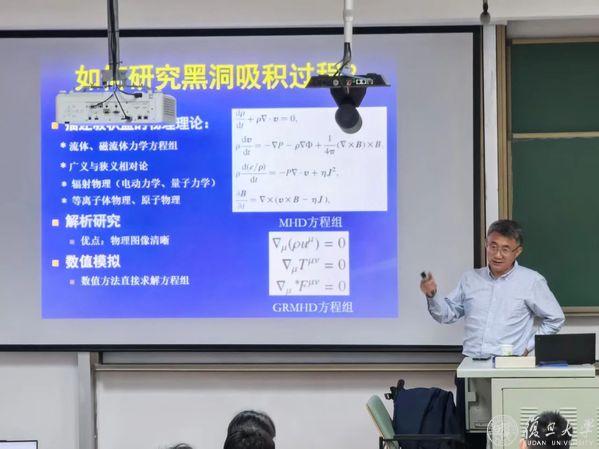 在复旦大学《物理前沿导论》的课堂上,袁峰教授正在介绍黑洞吸积理论。这门由32位物理学科骨干教师轮流介绍各自研究方向的学科导论课程始于2024年,覆盖了物理学系所有研究领域,帮助学生用一个学期的时间概览学科全局,培育科研志趣。尽管课程主要针对大一新生,但吸引了不少高年级学生跨级旁听。课后,23级物理学系本科生张子楠打算加入天体物理相关课题组进一步深入学习。