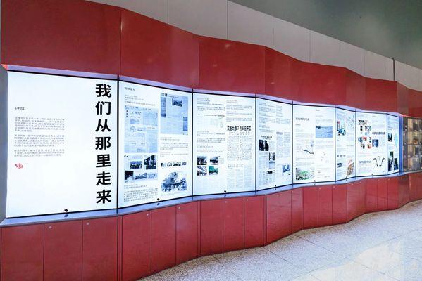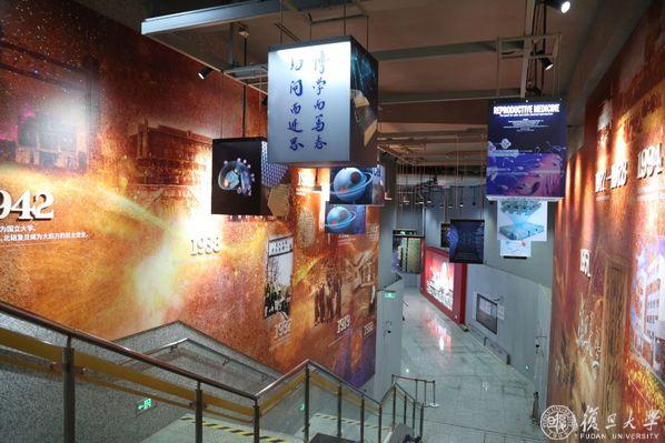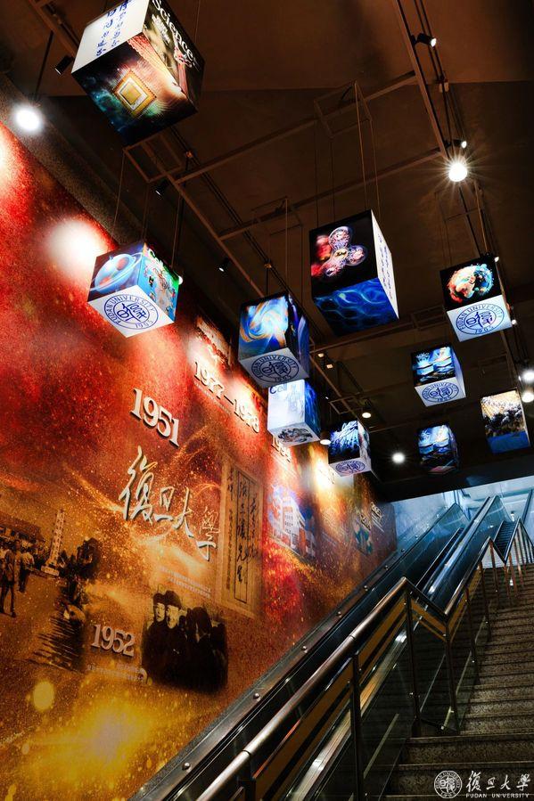 “时代步伐”展墙,扶梯两侧延展百廿校史电子长卷,见证两个甲子的星光交辉,顶部悬浮装置浓缩复旦重大科研成果,如学术星座点亮穹顶。