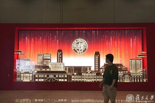 “群星荟萃”互动墙,以复旦百年校舍为叙事基底,通过动态光影矩阵重构“欢迎”的仪式感。墙体内嵌复旦历史影像浮雕层,昼间呈现建筑原生质感,夜间激活为星图载体。