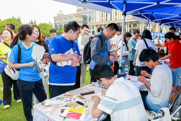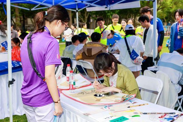 在活力跑同时,光草上的活力嘉年华也拉开帷幕。丰富好玩的摊位错落有致地排列,吸引师生、校友驻足。手工制作区里,有的师生专注地制作漆扇,有的品尝棉花糖。投壶摊位上,参与者们屏气凝神,将手中的箭投入壶中,体验雅趣。