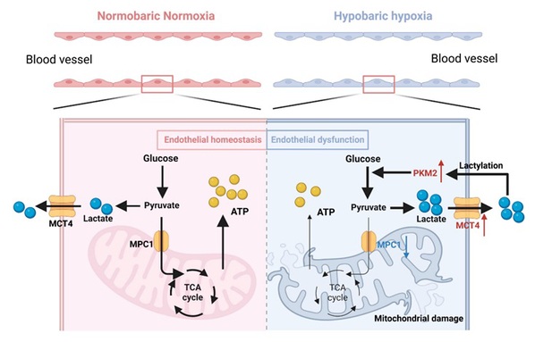 5月17日,人类表型组研究院刘新华研究员团队在Redox Biology期刊上发表了题为“Hypobaric hypoxia-driven energy metabolism disturbance facilitates vascular endothelial dysfunction”的研究论文。该团队借助环境模拟舱平台联合多组学研究,揭示了低压低氧环境下能量代谢紊乱与内皮功能障碍的联系,并深入探究了分子机制,为研究缺氧介导的内皮功能障碍提供了新思路。该团队发现,缺氧介导内皮功能障碍和能量代谢紊乱,进一步通过靶向代谢组学、转录组学和细胞能量代谢检测发现,缺氧导致内皮细胞糖酵解增加,氧化磷酸化降低。通过使用不同靶向药物抑制内皮细胞糖酵解通量可以缓解缺氧导致的内皮功能障碍,揭示了丙酮酸-乳酸轴通过调节内皮细胞能量代谢介导缺氧引起的血管内皮功能障碍。发现缺氧产生的大量乳酸,使PKM2乳酸化抑制其降解,从而增强内皮细胞能量代谢紊乱,加剧内皮功能障碍;而靶向丙酮酸-乳酸轴的调节可以维持糖酵解和氧化磷酸化之间的平衡,以保护血管内皮功能,该团队也利用高原环境模拟舱平台在体内对分子机制进行了验证。该研究具有重要的临床意义,为进一步探索中医药预防治疗高原或病理性缺氧相关的血管疾病提供了新的思路。
