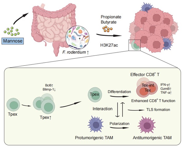 5月14日,复旦大学附属妇产科医院刘海鸥研究员团队在Cancer Research期刊上在线发表了题为“Mannose enhances Immunotherapy efficacy in ovarian cancer by modulating gut microbial metabolites”的研究。该研究首次揭示甘露糖通过增加粪杆菌属(F. rodentium)富集,促进Tpex细胞维持和分化,诱导三级淋巴结构TLS的形成改善卵巢癌抗PD-1治疗疗效的关键机制,为甘露糖增强癌症免疫治疗提供了理论依据和潜在的治疗策略。